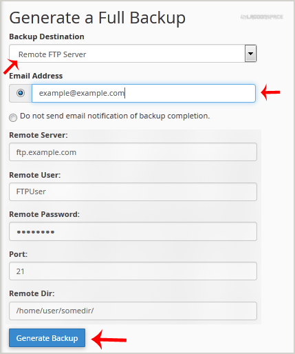 5. Once you fill in the Remote FTP details, click on the "Generate Backup" button.