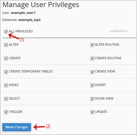 5. On "Manage User Privileges", mark the box "ALL PRIVILEGES" and click on "Make Changes".