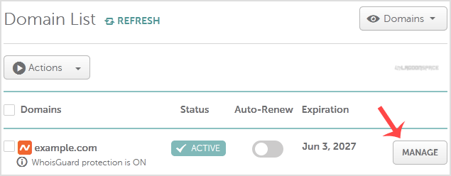 3. Under domain list, You can see list of your domains. In front of your domain click on dropdown menu and select "Manage".