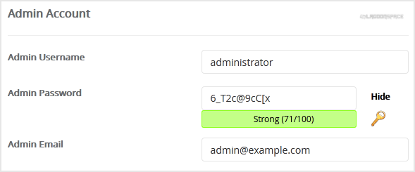 8. Under the "Admin Account" field enter the following information: