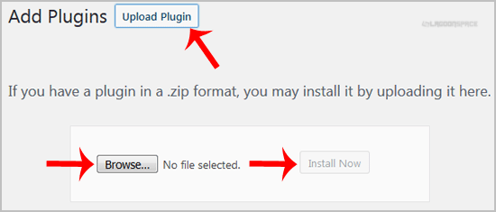 3. Click on “Upload Plugin†and then on “Browseâ€. Chose your plugin’s zip file and then click on “Install Nowâ€.